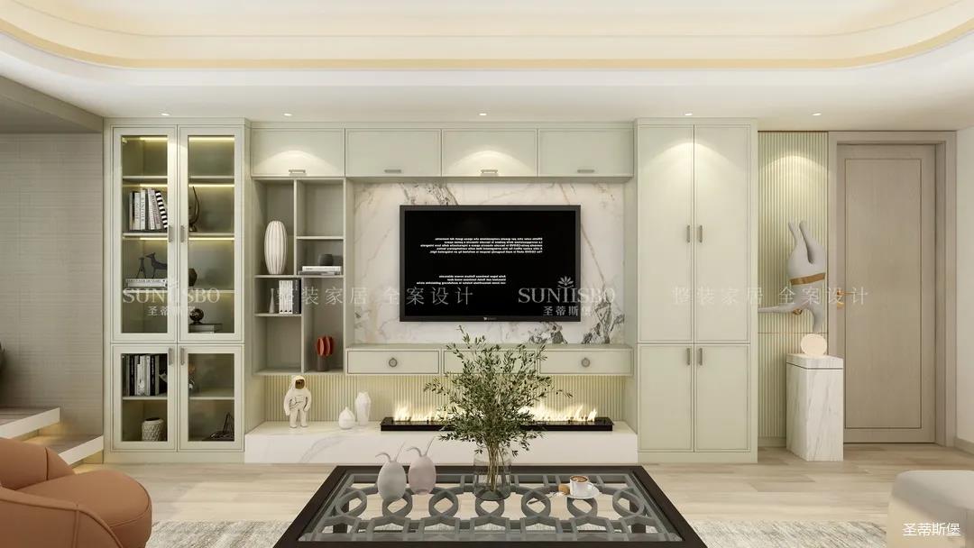 它以英倫爵士灰為柜體主調(diào),背景墻定制了整墻的儲物柜,色調(diào)懷舊復(fù)古的同時還夾帶著時尚摩登氣息,明暗收納合理分區(qū),電視被實木飾面包圍,使空間視覺得以延伸,美觀收納兩不誤。