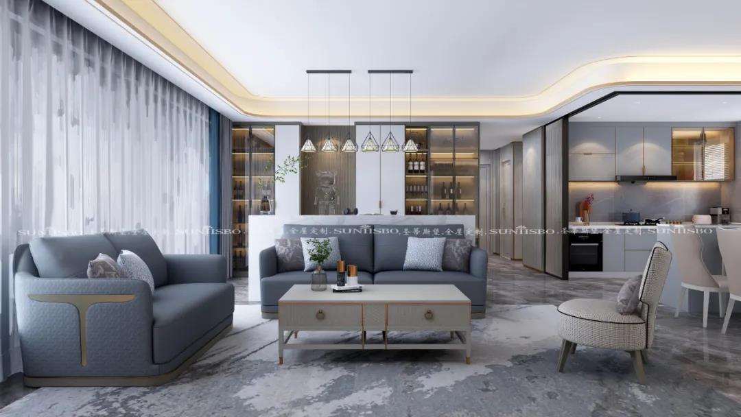 “七分藏三分漏”的設(shè)計理念是簡奢風格中應(yīng)用最多的,運用隱藏式玻璃移門或拉門,可避免做全開方式收納導(dǎo)致的積灰、難清理等問題。玻璃材質(zhì)本身的特質(zhì)就是時尚的代表,而且具有極好的抗氧化性和防潮等功能,天然環(huán)保。其通透明亮的質(zhì)感,且無繁復(fù)裝飾,直接連接了空間整體性,賦予了空間自由舒適的寧靜感。