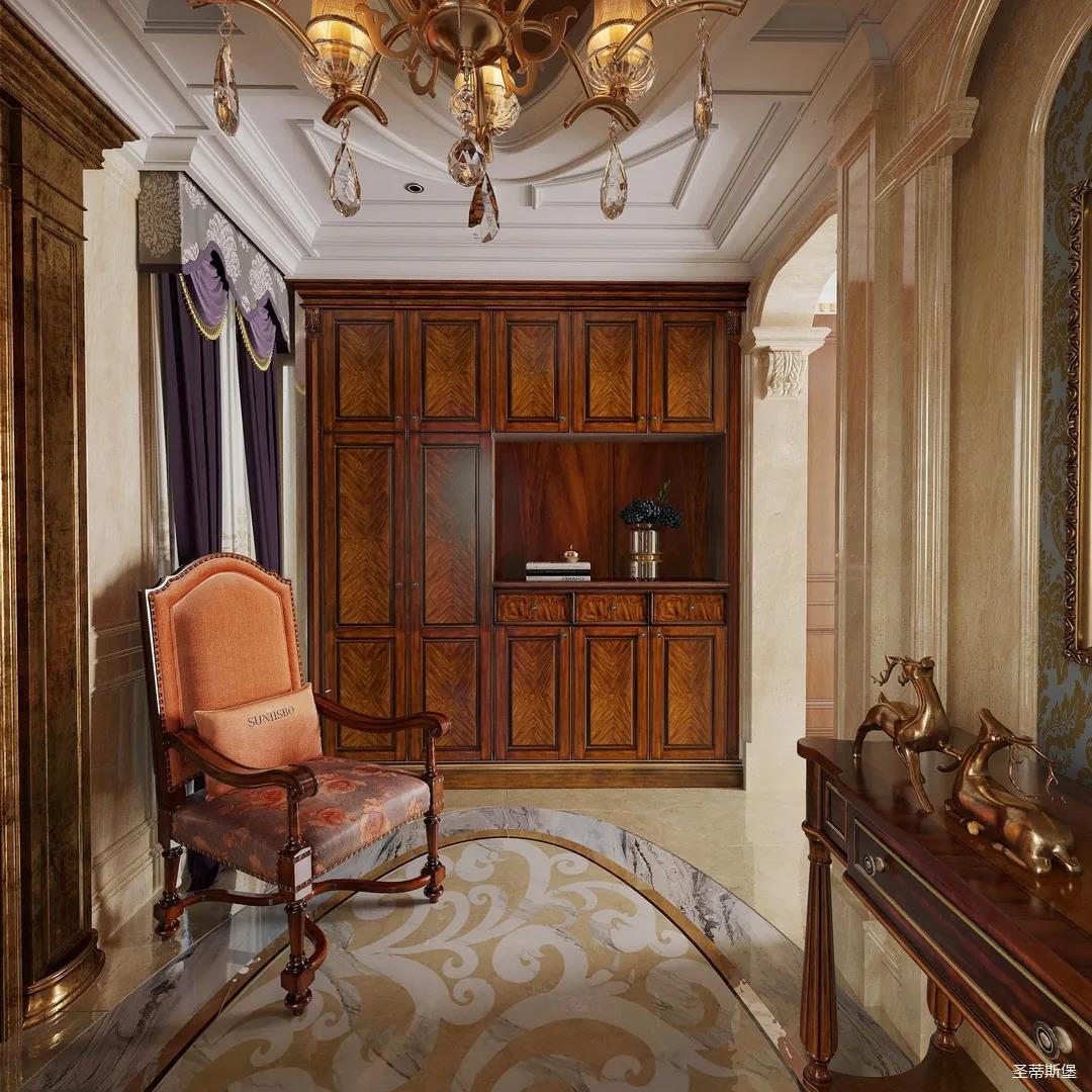 進(jìn)入玄關(guān),即刻被吸引,懷舊的啞光漆面上點(diǎn)綴著古典的輪廓線與精致的雕花,仿佛進(jìn)入了一座古老的森林城堡,神秘悠遠(yuǎn)。隨處可見(jiàn)的黃銅元素,不僅給室內(nèi)帶來(lái)了奢華質(zhì)感,也彰顯著主人好客氣質(zhì)。